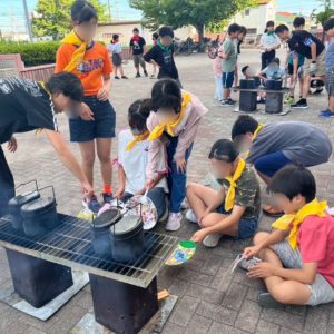 子どもたちは火起こし係、飯盒係、調理係に分かれて作業。