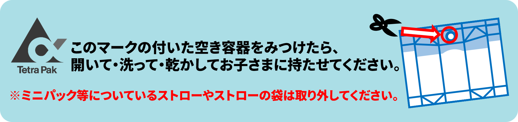 テトラパック回収についてのお願い 開いて、洗って、乾かして、集める。 ・ 紙容器を「開いて、洗って、乾かす」時などに手指を傷つける等ケガのないよう十分気をつけてください。・ 一部のキャップ付き容器の本体についている注ぎ口の内側の歯が鋭くなっております。 牛乳バックについている注ぎ口(フラップ)部分は、後ろから押すと、注ぎ口を後ろから押すと、簡単に取り外すことができます。取り外した注ぎ口(プラスチック)部分は、切り取ってから回収BOXへ。 資料ダウンロード テトラパック資料ダウンロード